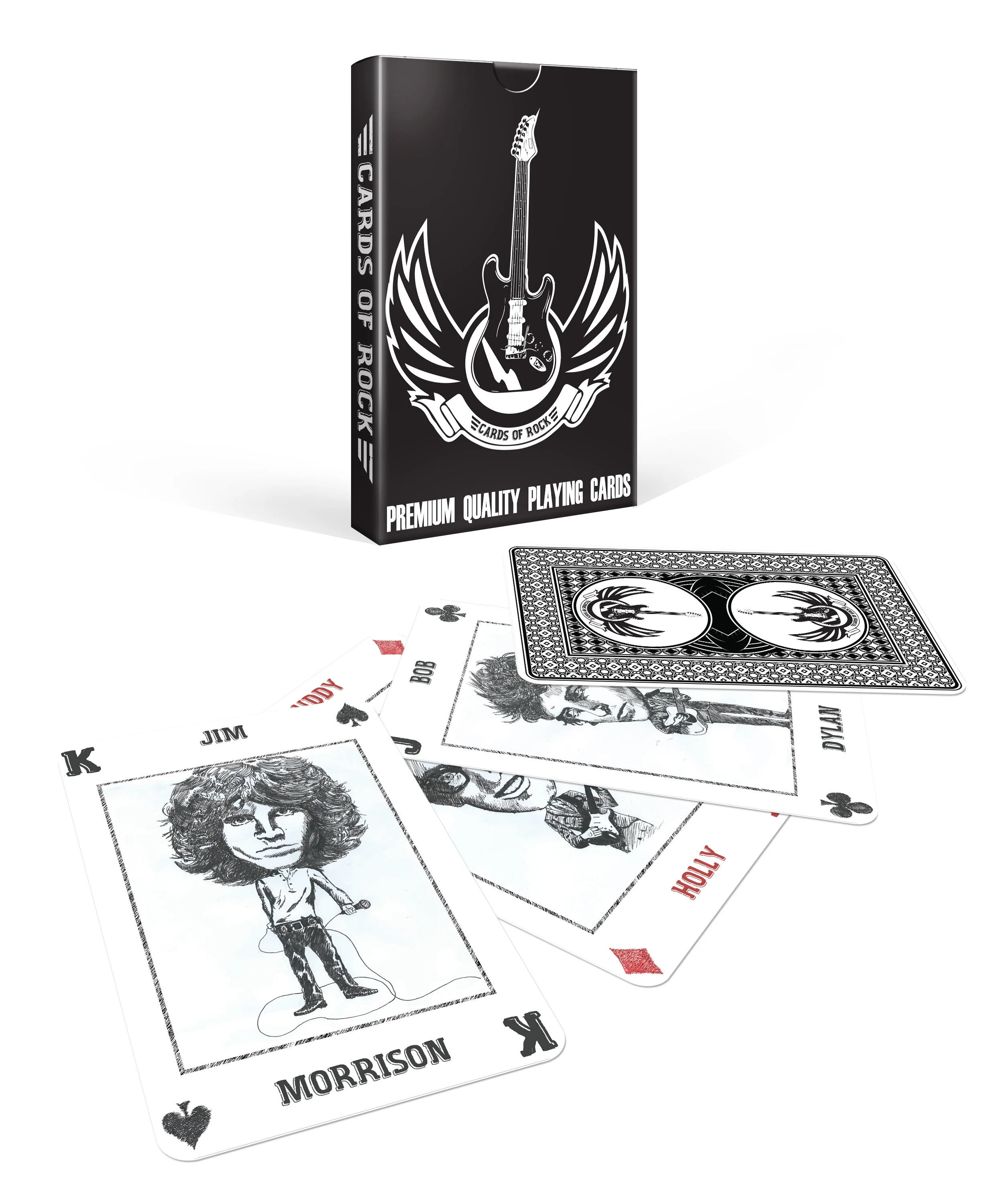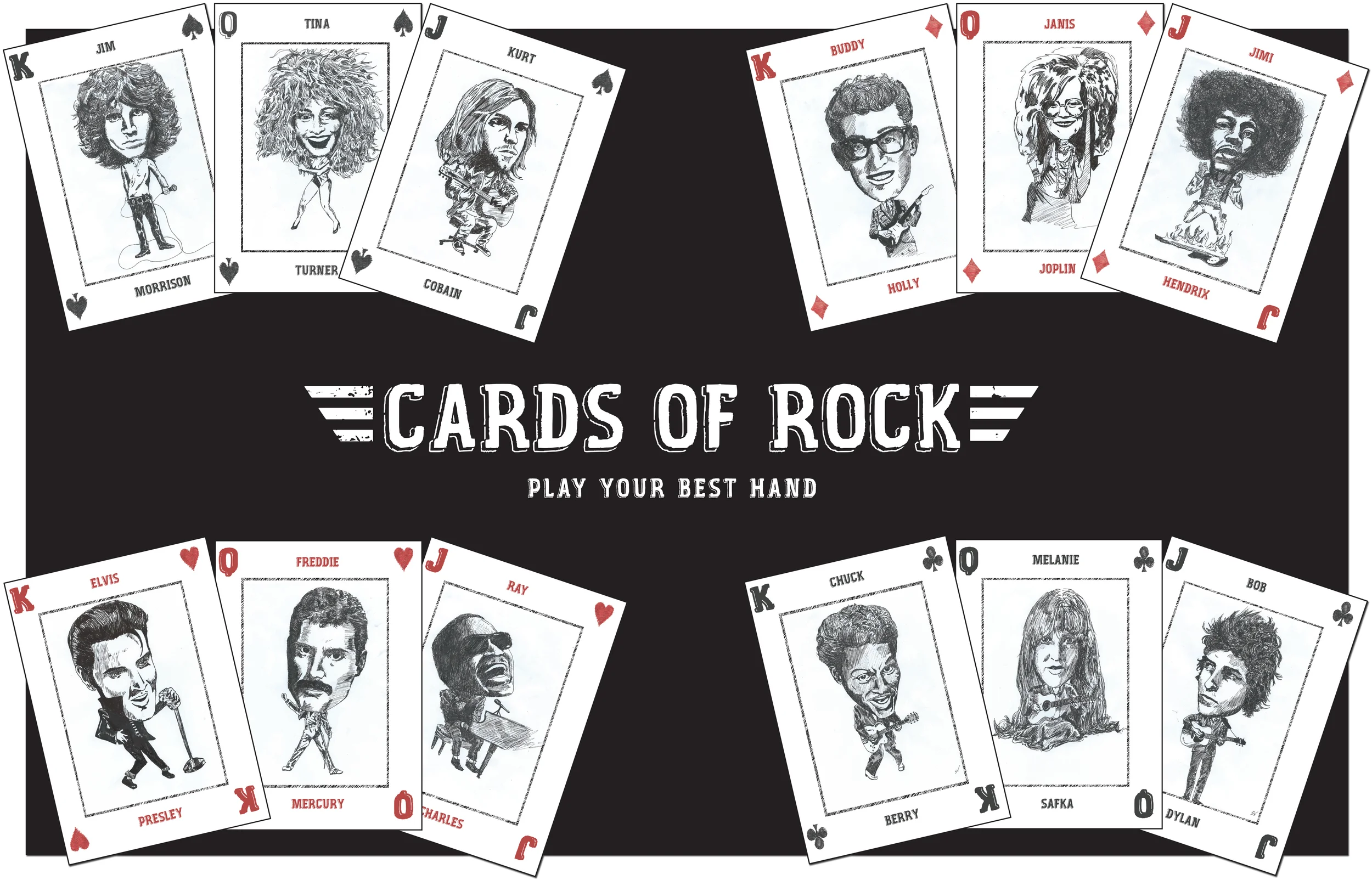 Cards of Rock are playing cards with hand drawn illustrations of iconic rock stars. The rock star that appears on each card will have a relation to that specific card.