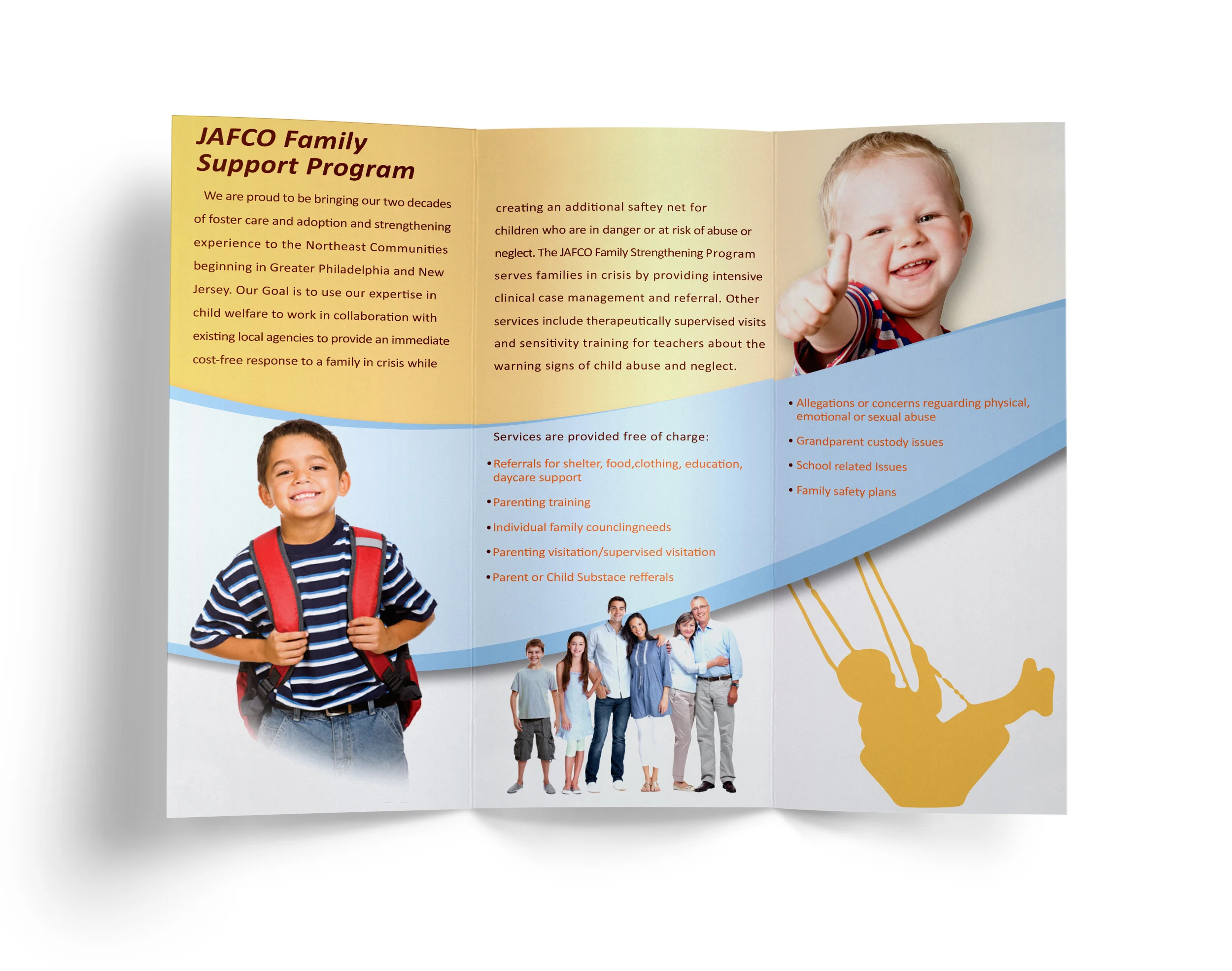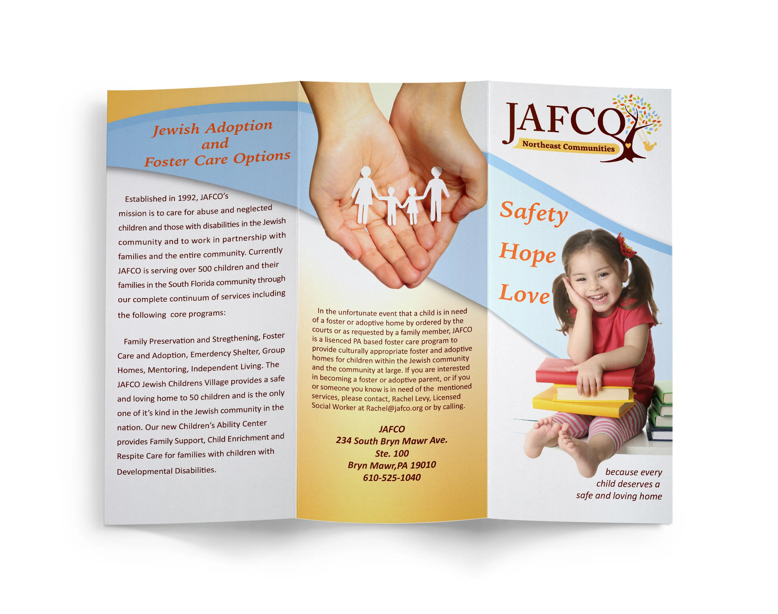 The Brochure was designed using the organization’s colors, and contain a positivemessage of hope for abused children. The information in the brochure describes JAFCO’s Family support programs and contact information.